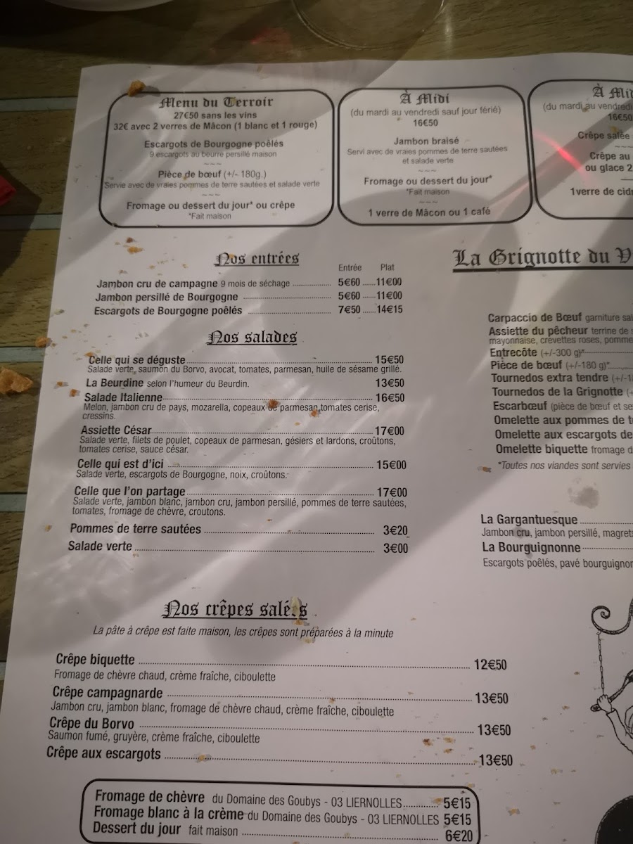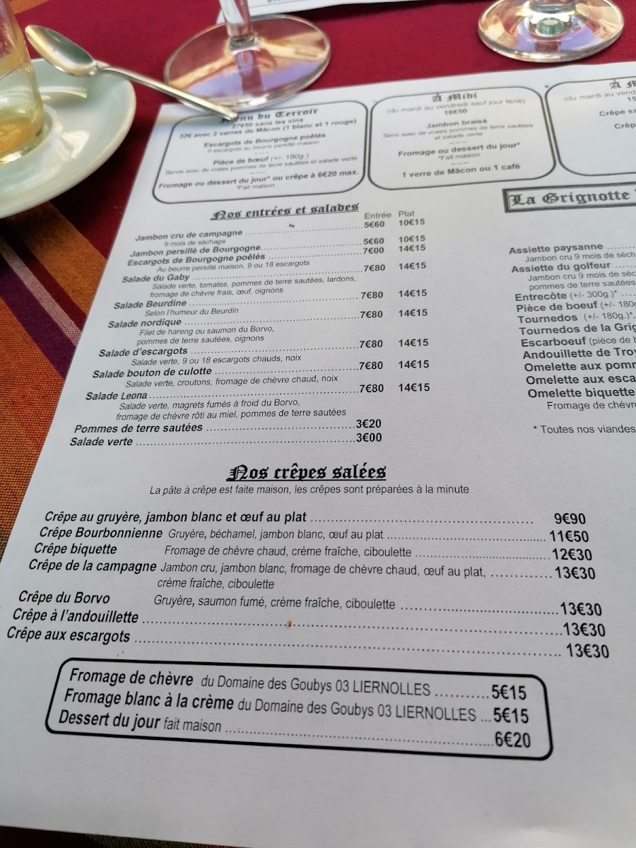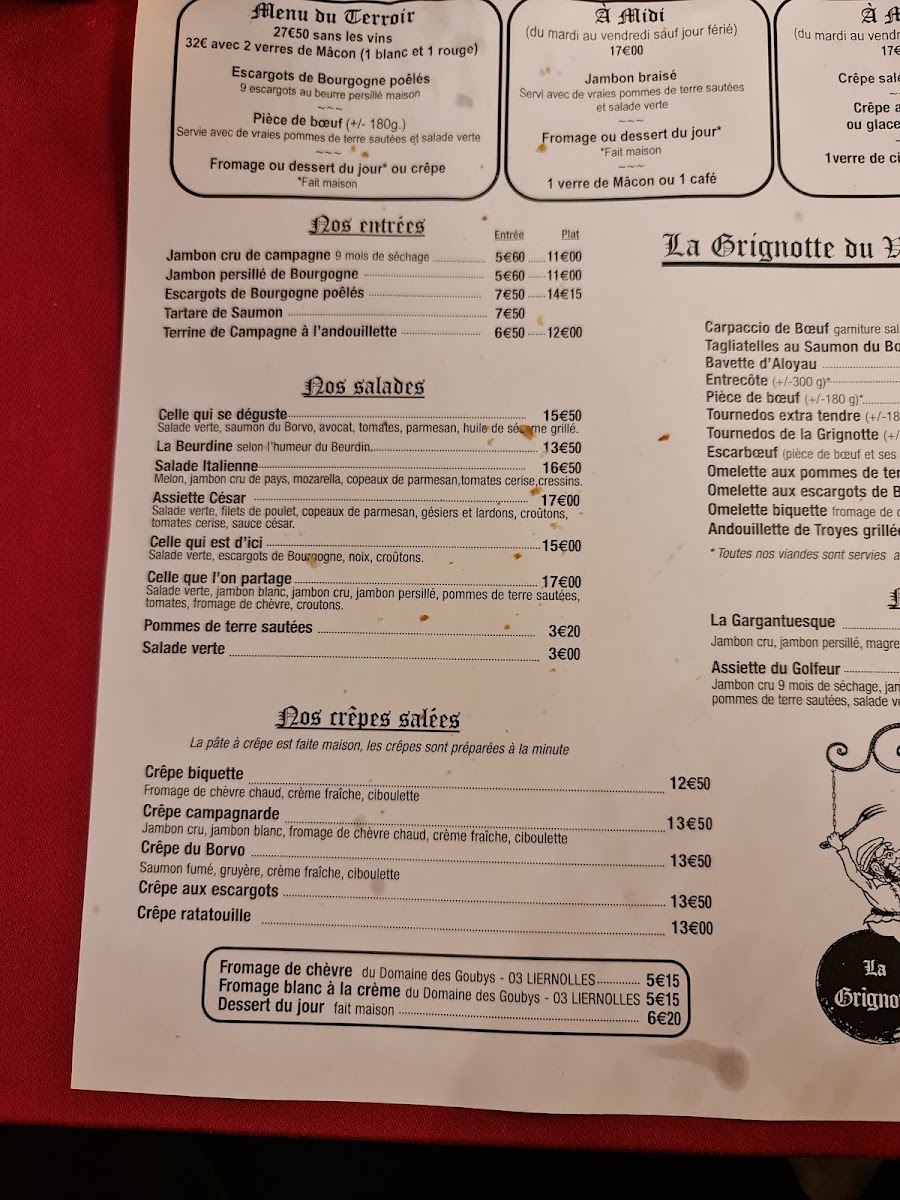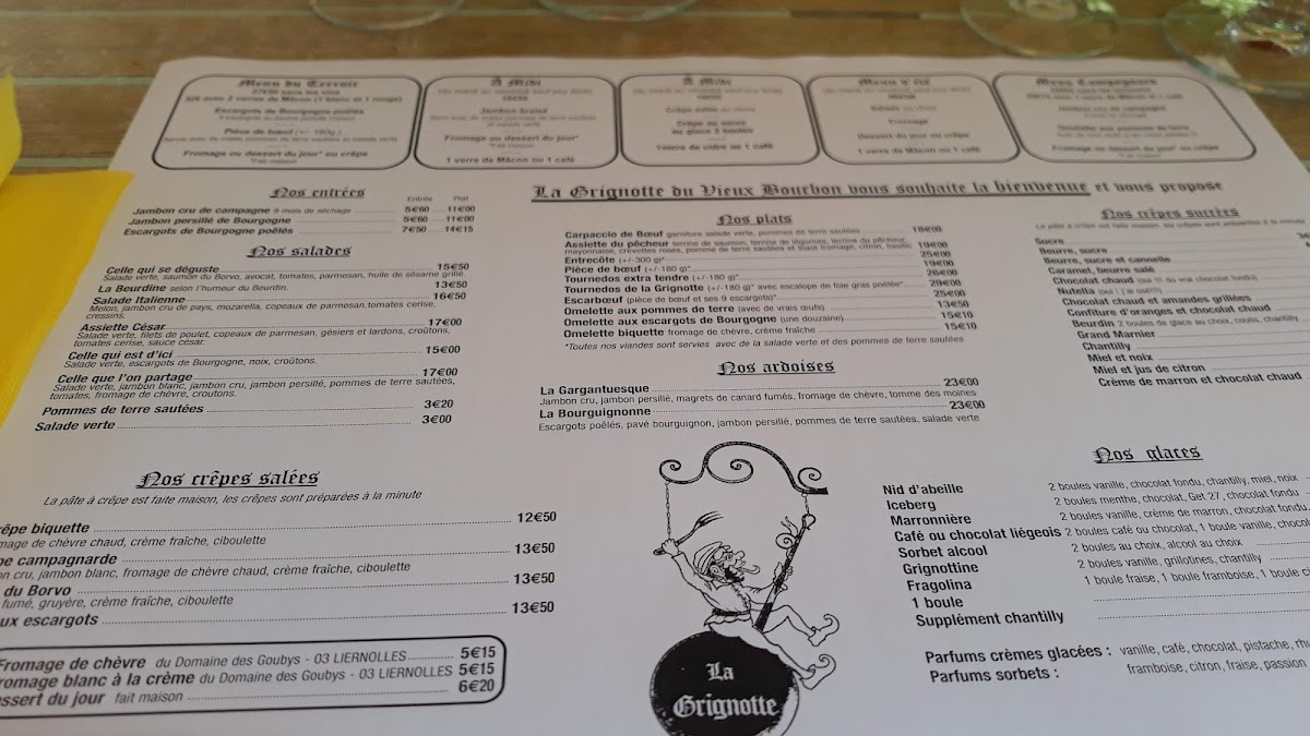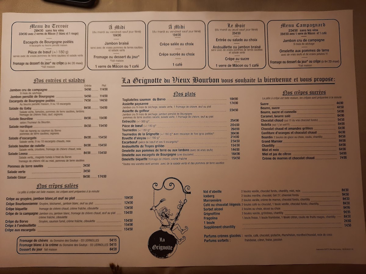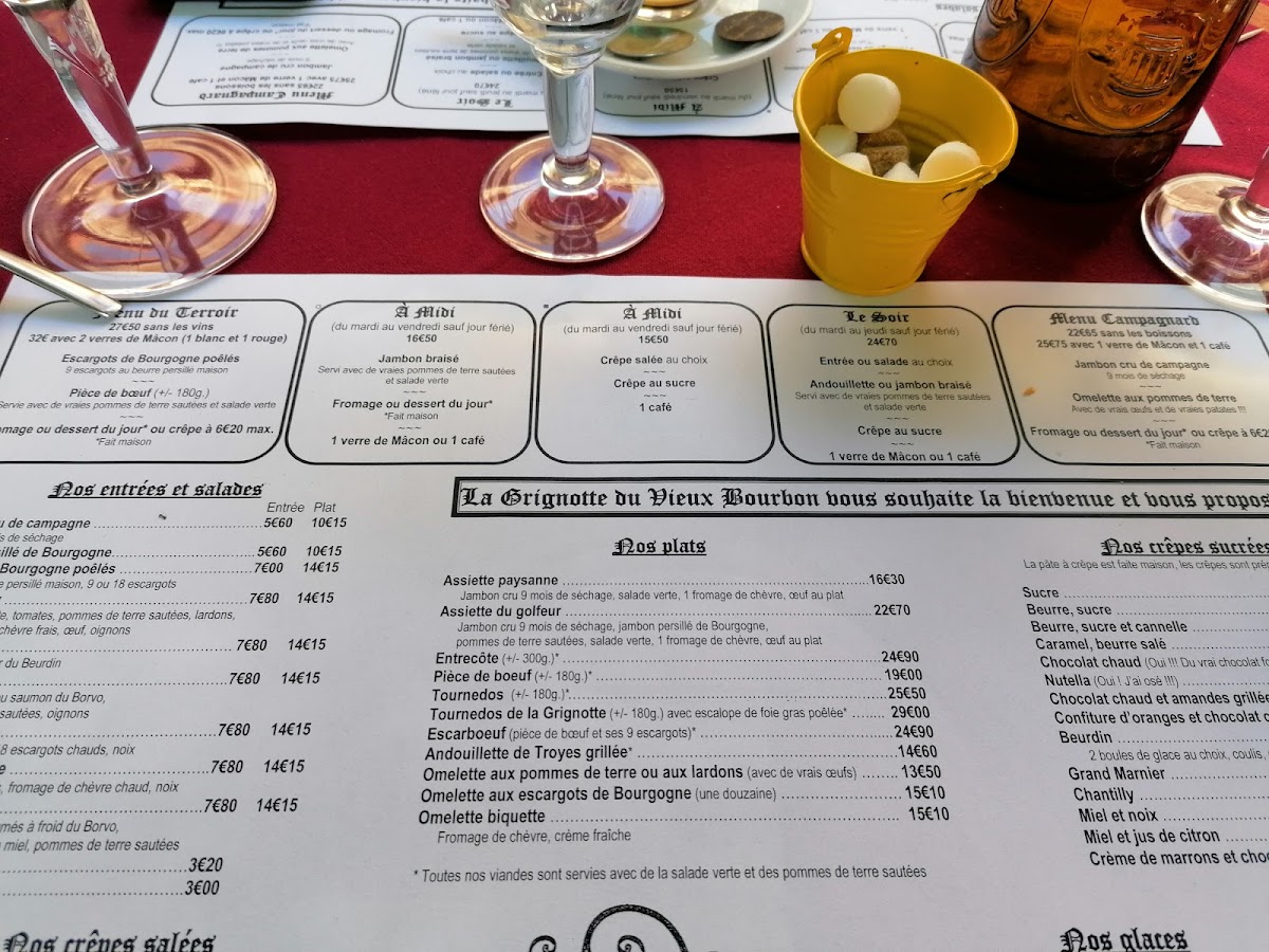 At Restaurant La Grignotte Du Vieux-Bourbon, the menu reads like a confident snapshot of French brasserie comfort, mixing regional character with crowd-pleasing classics. The savory selection anchors the experience: Steak And Frites Maison W Salad delivers exactly what it promises-well-executed beef, crisp fries, and a fresh counterbalance-while Entrecote and Carpaccio De Boef underline a respect for quality meat and straightforward preparation. The kitchen’s personality shows through specialties like Escargots, Escarboeuf, and Salade d'escargots Et Croûtons Avec Salade Et Tomates, offering earthy, indulgent flavors that feel rooted in tradition rather than trend.