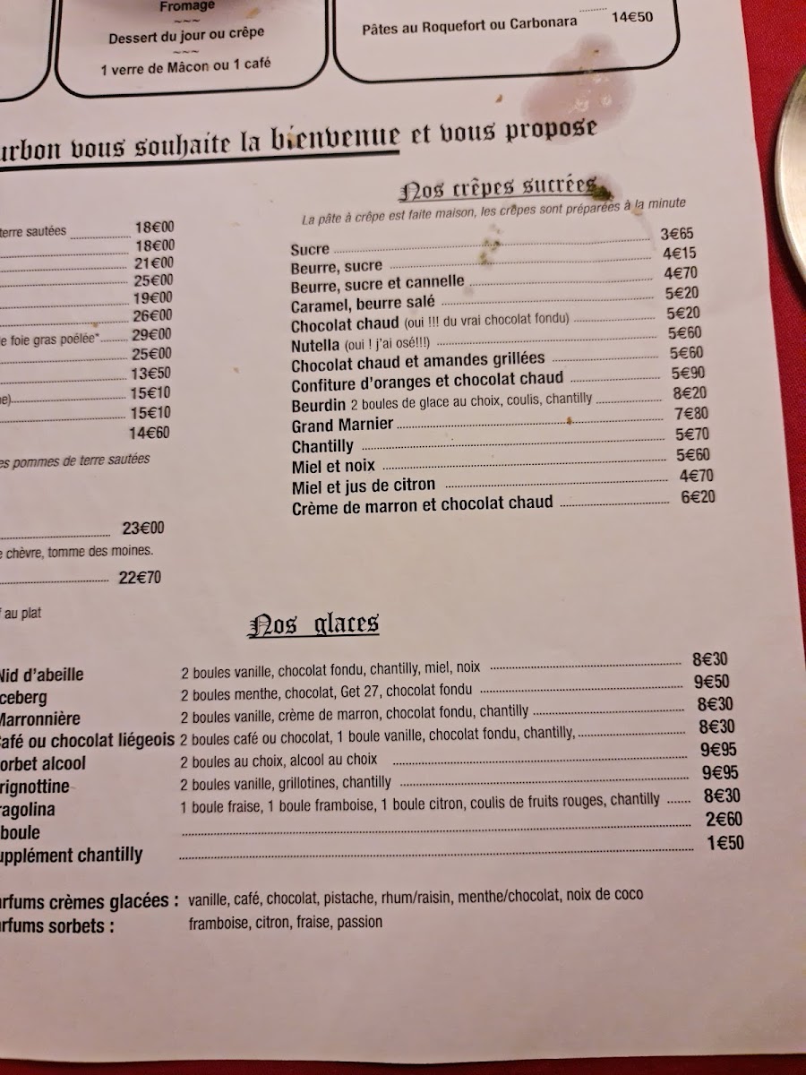 Desserts and sweets are where the menu leans into pleasure without pretense. Crêpes are a recurring highlight-Crêpe Confiture D'oranges Chocolat Chaud, Crêpe Caramel Chocolat, and Crêpe Orange Et Chocolat Maison-each offering a distinct play on chocolate and citrus. For those who prefer a chilled finish, Glace Vanille Noix Miel Coulis Chocolat delivers layered sweetness and texture, while Café Plus Que Gourmand is an inviting way to sample multiple treats alongside coffee.